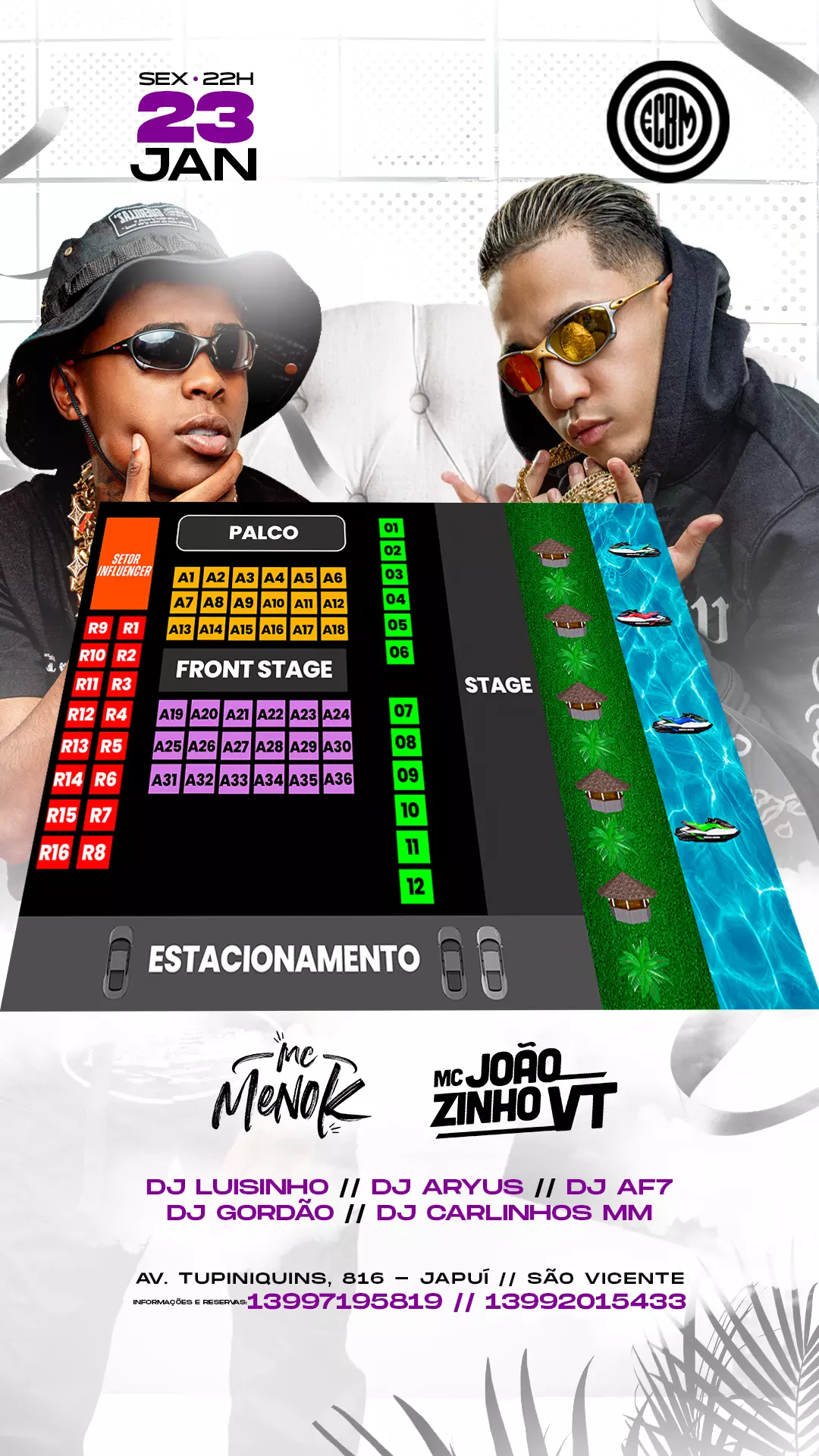 No comando do palco, Meno K — Top 1 Global no Spotify e o cara do momento — divide a cena com MC Joãozinho VT, trazendo os hits que dominam as ruas, as plataformas e as pistas.